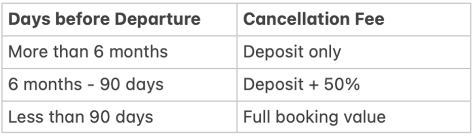 The cancellation fees will be an amount determined by the table below, except where otherwise indicated.